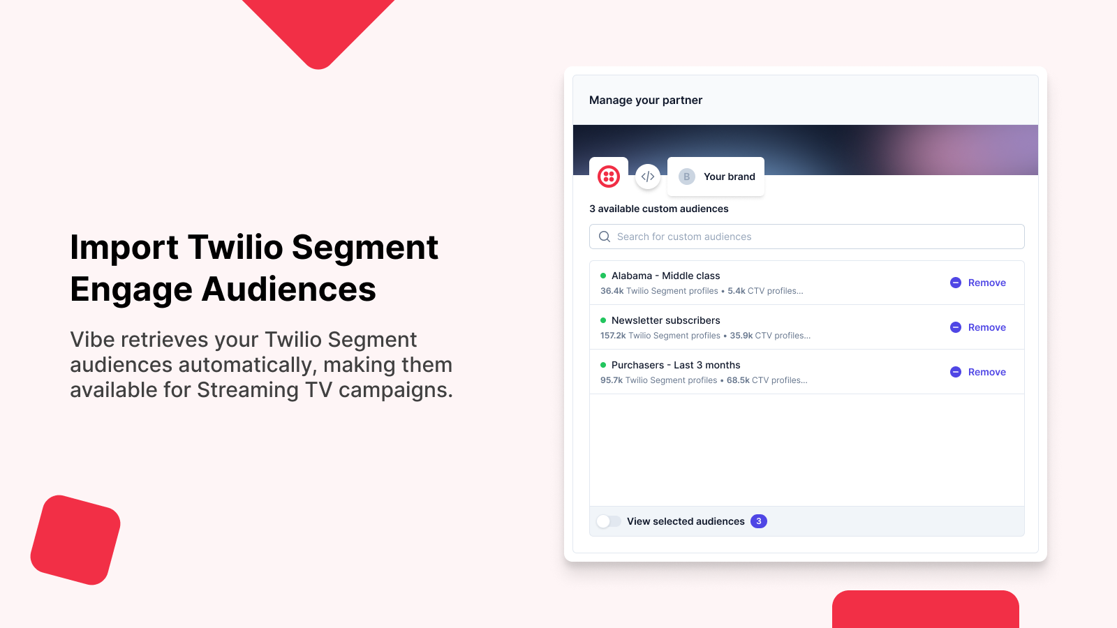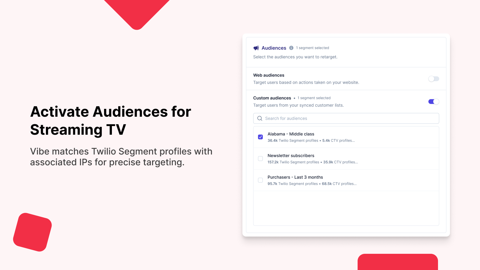 Connect Twilio Segment to Vibe to automatically sync your audiences and retarget your customers on Connected TV. Use your existing Segment traits, events, or lists to reach the right people with highly relevant ads on the big screen.